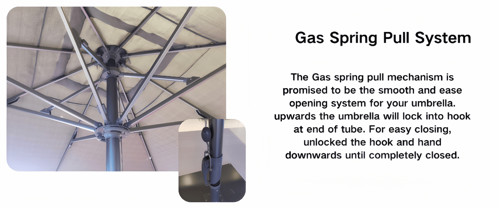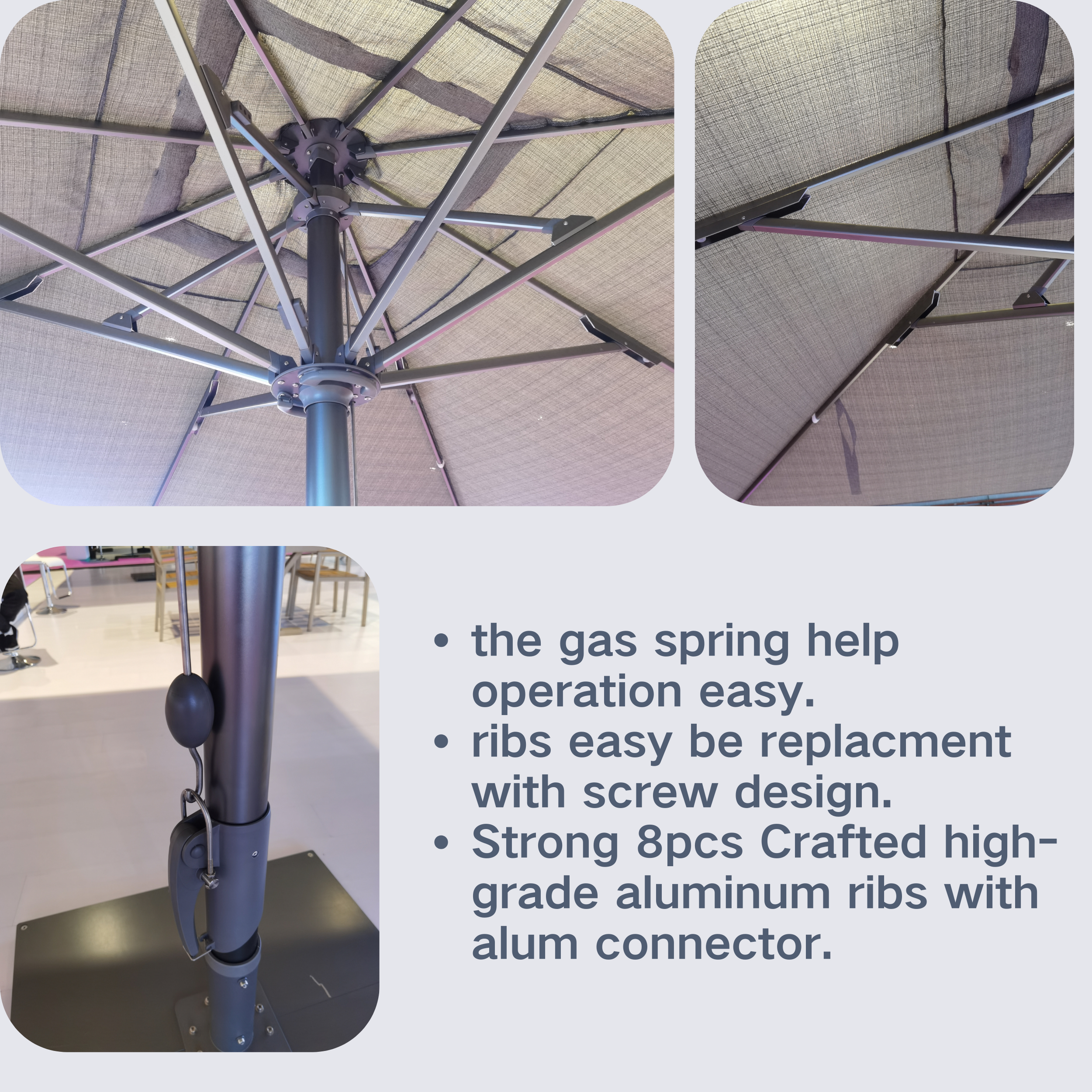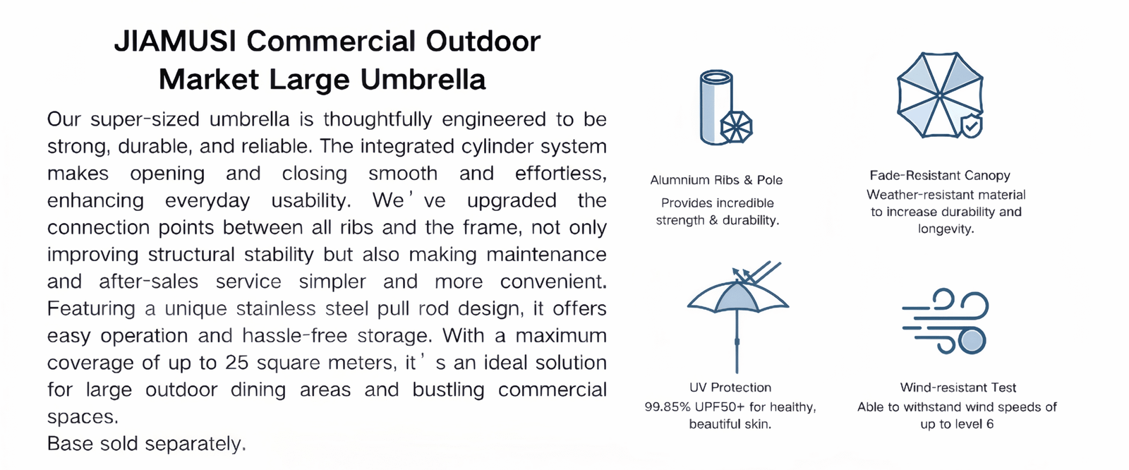Our super-sized umbrella is thoughtfully engineered to be strong, durable, and reliable. The integrated cylinder system makes opening and closing smooth and effortless, enhancing everyday usability. We’ve upgraded the connection points between all ribs and the frame, not only improving structural stability but also making maintenance and after-sales service simpler and more convenient. Featuring a unique stainless steel pull rod design, it offers easy operation and hassle-free storage. With a maximum coverage of up to 25 square meters, it’s an ideal solution for large outdoor dining areas and bustling commercial spaces.